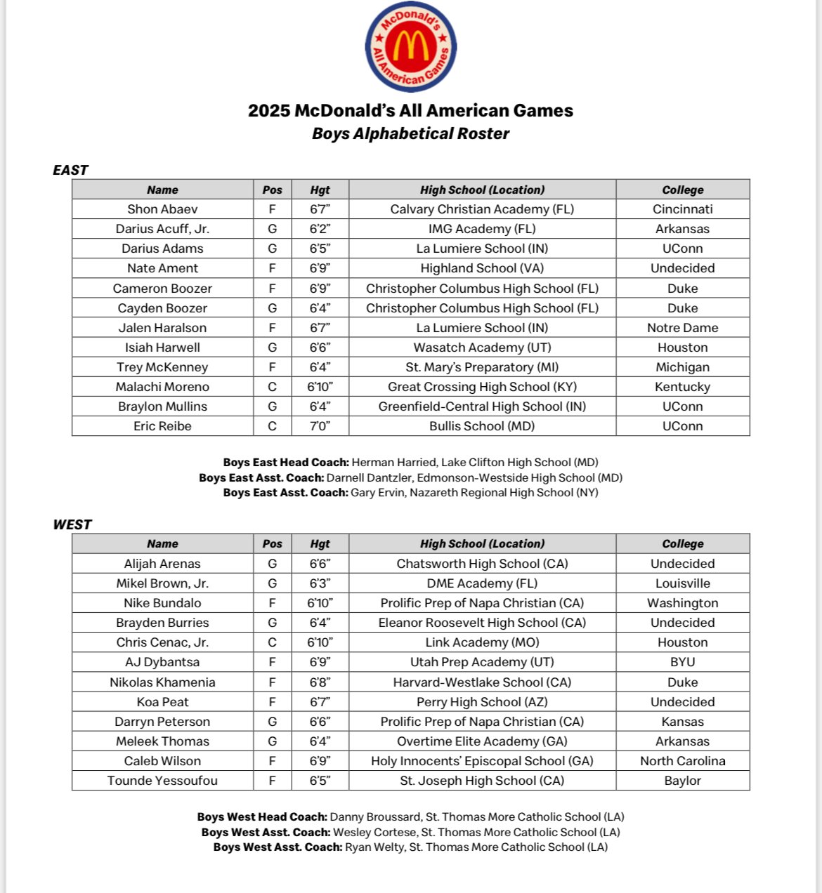 杜克大學(xué)和康涅狄格大學(xué)分別有3名球員入選,其中包括前NBA球星卡洛斯-布澤爾的雙胞胎兒子——卡梅隆和凱登。另外,楊百翰大學(xué)狀元熱門AJ-迪班薩,和堪薩斯大學(xué)狀元競爭者達(dá)林-彼得森也毫無懸念入選。還未做出擇校決定的內(nèi)特-阿門特、科阿-皮特和阿里納斯之子阿利賈-阿里納斯也在名單之中。