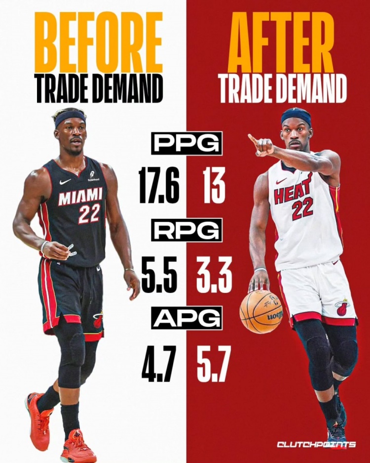 申請(qǐng)交易前巴特勒?qǐng)鼍?7.6分5.5籃板4.7助攻、申請(qǐng)交易后(三場(chǎng))場(chǎng)均13分3.3籃板5.7助攻