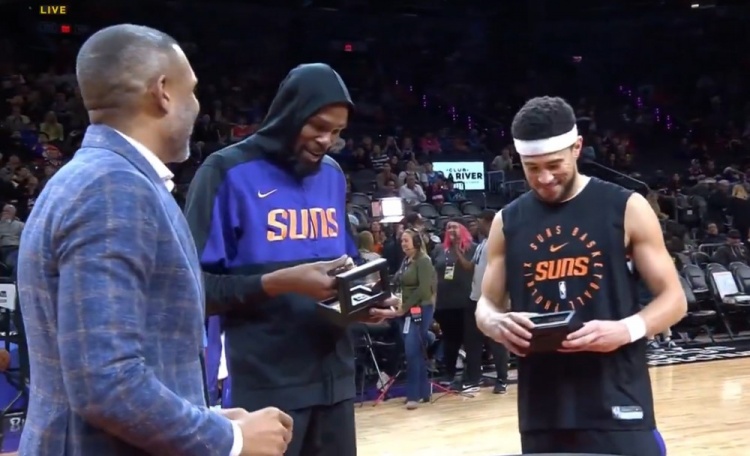 1月29日訊 昨天太陽(yáng)的比賽,美國(guó)男籃總經(jīng)理格蘭特-希爾向杜蘭特和布克頒發(fā)了巴黎奧運(yùn)會(huì)的冠軍戒指。