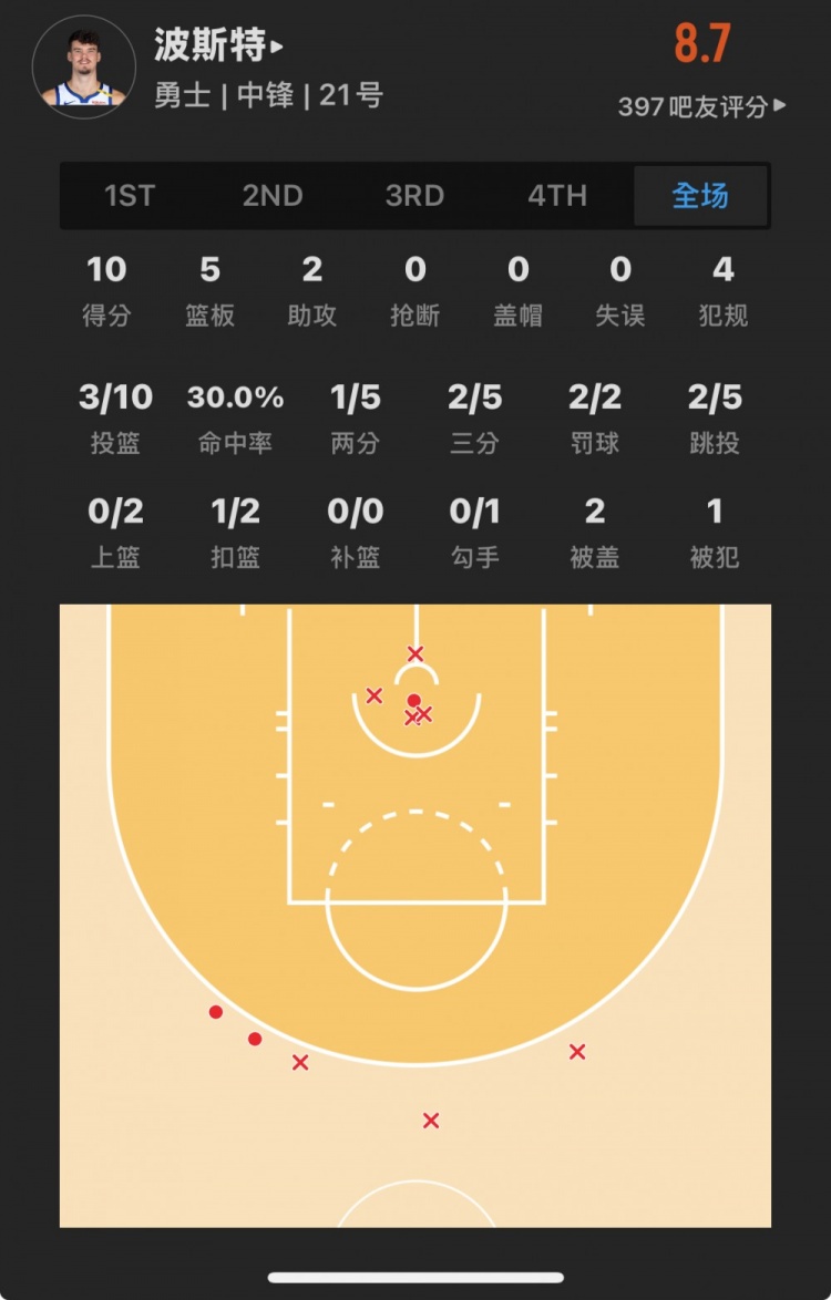 勇士52號(hào)秀 昆滕-波斯特 登場(chǎng)16.1分鐘