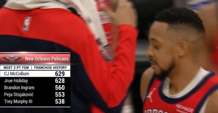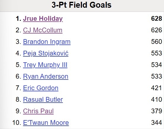本場(chǎng)比賽過(guò)后,麥科勒姆鵜鶘生涯三分命中數(shù)來(lái)到629,超越朱-霍勒迪,上升至隊(duì)史第一,詳情如下:
