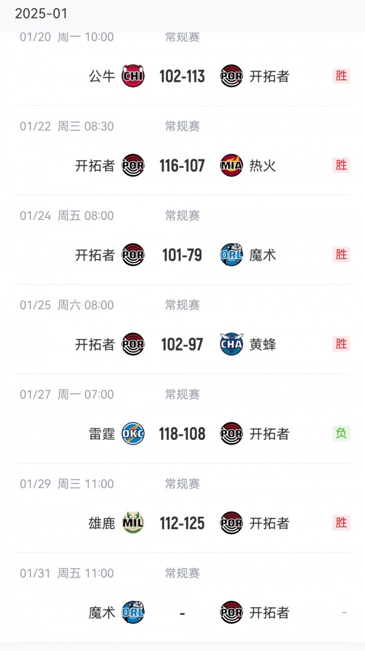 至此,在過(guò)去7場(chǎng)比賽中,開拓者豪取6勝1負(fù)。其中兩勝魔術(shù),僅輸給了雷霆。