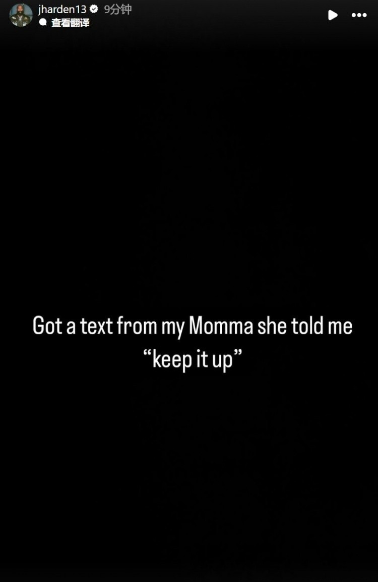 隨后,哈登在INS更新動(dòng)態(tài)寫道:“我媽媽發(fā)短信給我了,她說(shuō)‘繼續(xù)保持’?!?/p>
