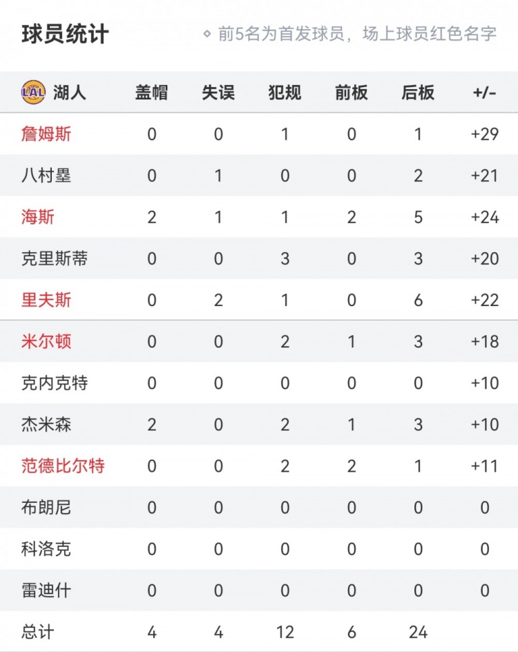半場比賽,湖人每名出場球員正負(fù)值都很高,均達(dá)到了兩位數(shù)。