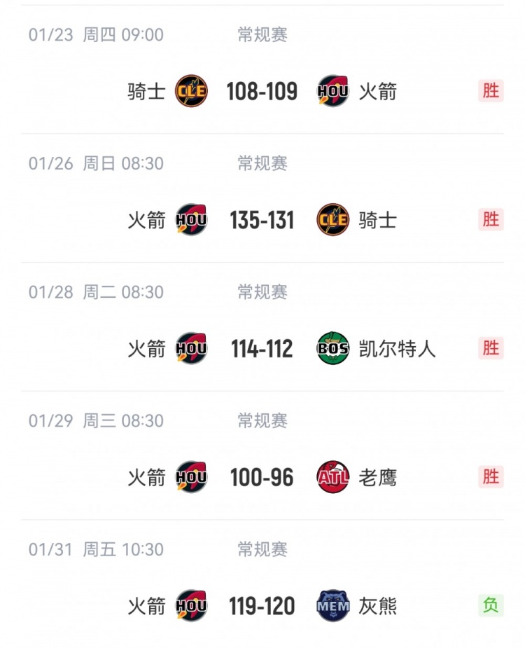 在過去5場比賽中,火箭每場比賽分差都不超過4分,期間火箭4勝1負。