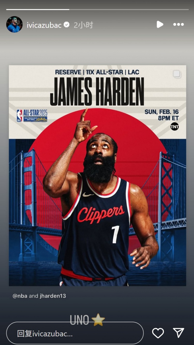 - 老大哥哈登入選全明星!祖巴茨轉發(fā)相關動態(tài):UNO?
