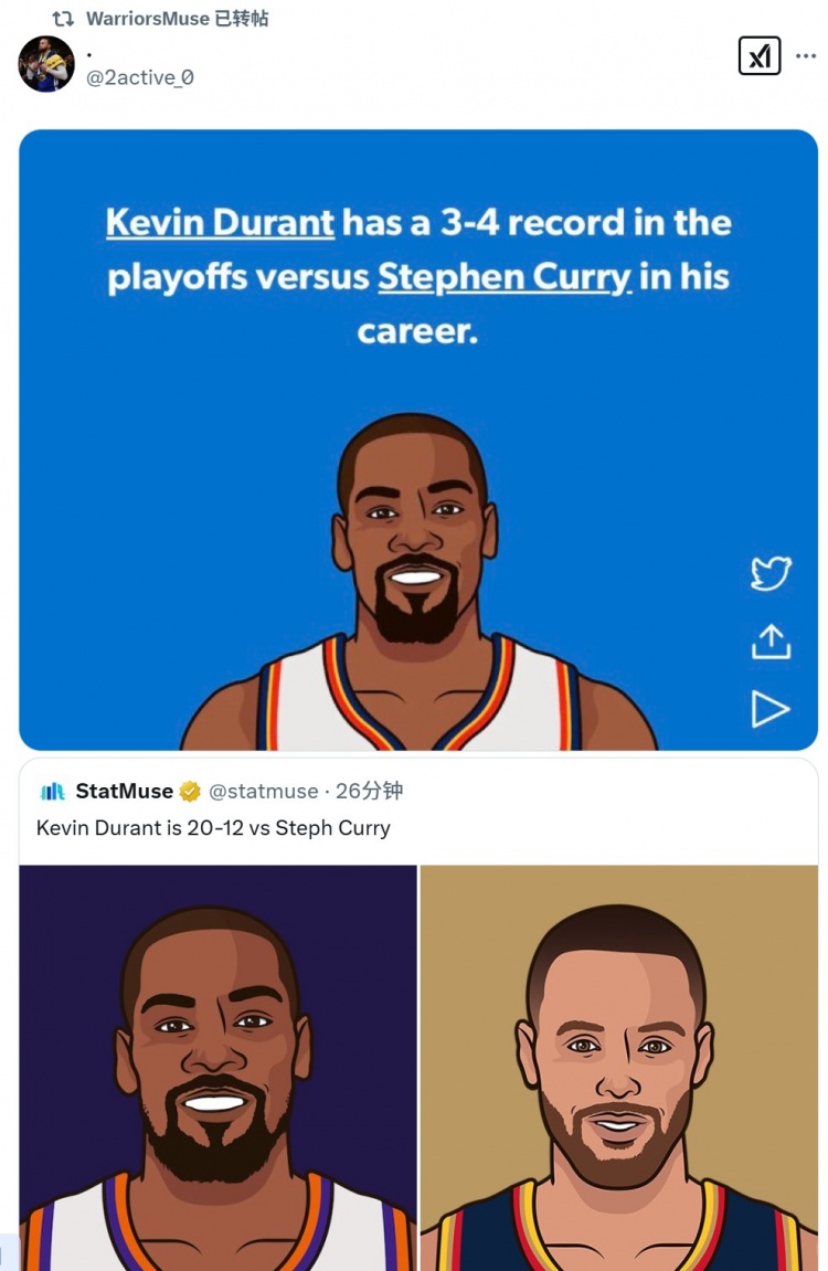 有勇士球迷轉(zhuǎn)發(fā)了美媒StatMuse發(fā)的相關(guān)內(nèi)容,曬出了杜蘭特季后賽生涯對(duì)陣庫里的戰(zhàn)績(3勝4負(fù))。