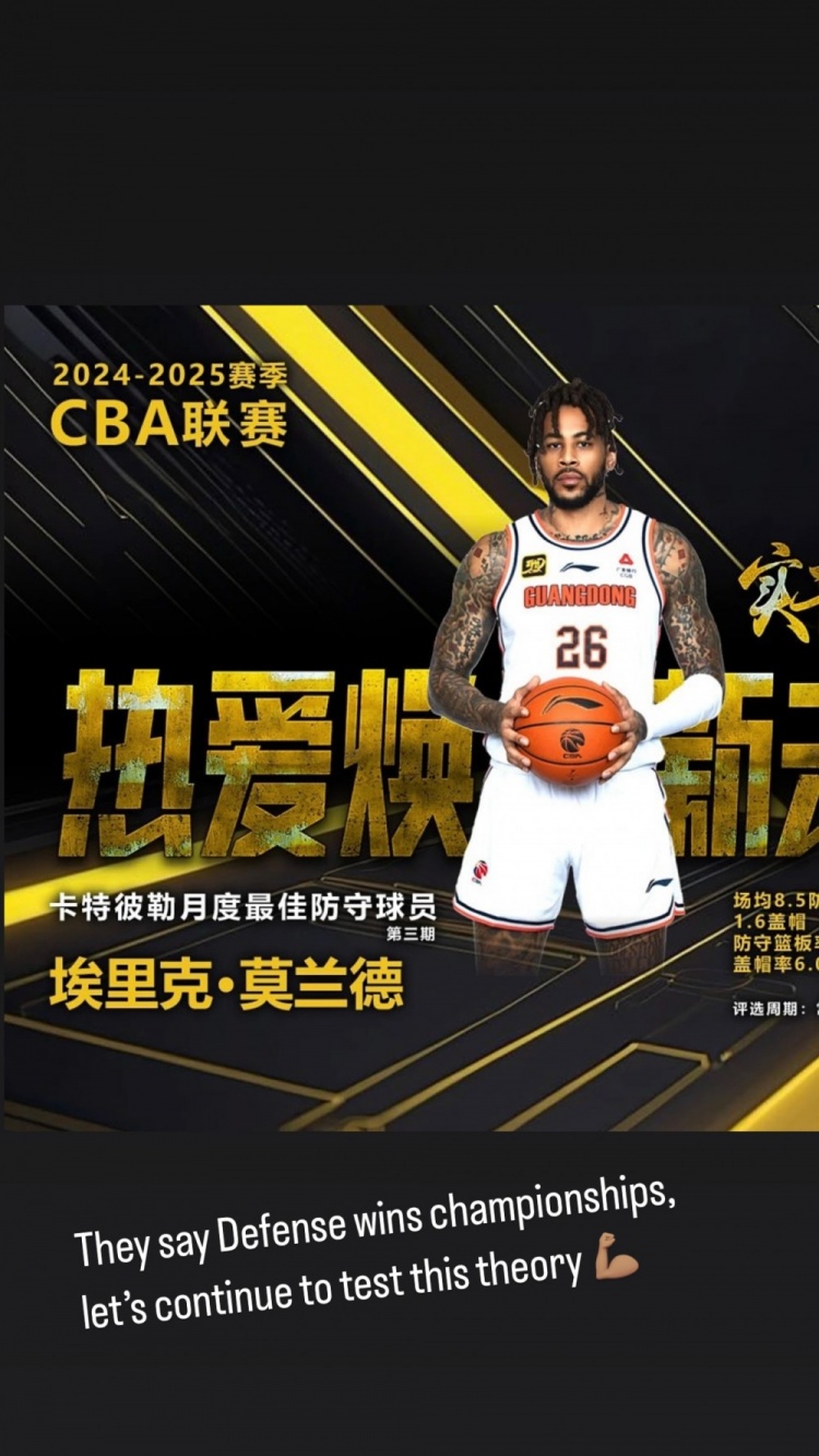 發(fā)布時間:2025年02月01日 21:58點擊:欄目:籃球新聞 2月1日訊 今天,廣東外援莫蘭德更新了個人社媒。莫蘭德曬出自己榮膺月度最佳防守球員的照片,并配文寫道:“他們說防守贏得總冠軍,讓我們繼續(xù)驗證這一理論 除特別注明外,本站所有內(nèi)容均為九球直播整理排版,轉(zhuǎn)載請注明出處:莫蘭德:他們說防守贏得總冠軍 讓我們繼續(xù)驗證這一理論 本文標簽: CBA 中國籃球 籃球 廣東