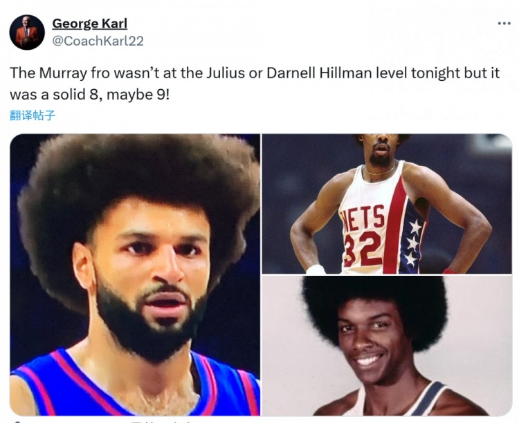 前掘金主帥喬治-卡爾對此點評道:“穆雷的爆炸頭沒有J博士或達內(nèi)爾-希爾曼的帥,今天這個我打8分、9分也行。”