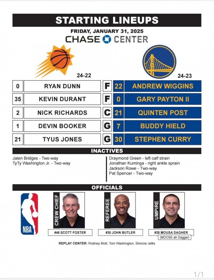 2月1日訊 今天中午11點,勇士將對陣太陽。賽前,雙方公布首發(fā)陣容。