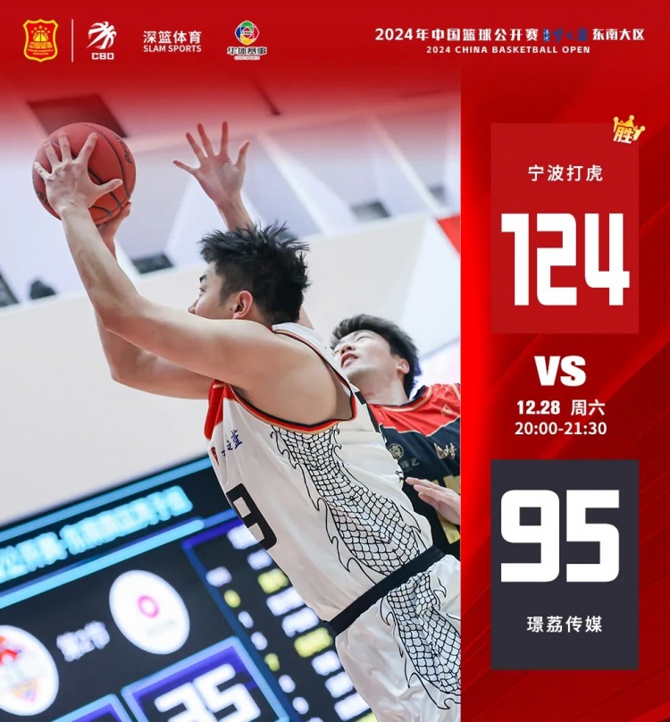 比賽開始,寧波打虎98號(hào)王宇接4號(hào)江楠助攻,兩分命中,幫助球隊(duì)拿下第一分。璟荔傳媒0號(hào)脫凡防守端搶斷立功,17號(hào)林輝輝進(jìn)攻得手。雙方比分交替上升,但較大的防守強(qiáng)度給隊(duì)員的體能帶來不小壓力,上半場(chǎng)后程璟荔傳媒進(jìn)攻端失誤增加,寧波打虎抓準(zhǔn)機(jī)會(huì)拉開分差,攜帶16分優(yōu)勢(shì)進(jìn)入下半場(chǎng)。下半場(chǎng)開始璟荔傳媒奮起反擊,17號(hào)林輝輝、22號(hào)衛(wèi)炬吉拼搶相當(dāng)積極,隊(duì)內(nèi)5人得分上雙,但無奈寧波打虎全隊(duì)實(shí)力超群,得分點(diǎn)較多,實(shí)力堅(jiān)挺,本場(chǎng)9人得分上雙,最終順利以124-95戰(zhàn)勝璟荔傳媒,打進(jìn)冠亞軍決賽。