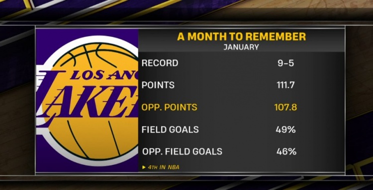 賽前轉(zhuǎn)播方分享了一組數(shù)據(jù):湖人在一月份戰(zhàn)績?yōu)?勝5負,場均得到111.7分,失分107.8分(聯(lián)盟第四少),投籃命中率49%,對手投籃命中率46%。