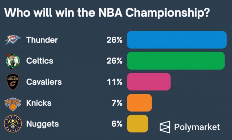 發(fā)布時(shí)間:2025年02月02日 10:54點(diǎn)擊:欄目:籃球新聞 美媒Polymarket Sports預(yù)測 除特別注明外,本站所有內(nèi)容均為九球直播整理排版,轉(zhuǎn)載請(qǐng)注明出處:美媒預(yù)測奪冠概率:雷霆&綠軍皆26%最高 騎士/尼克斯/掘金列3-5 本文標(biāo)簽: 籃球 nba 雷霆 凱爾特人 騎士 尼克斯 掘金