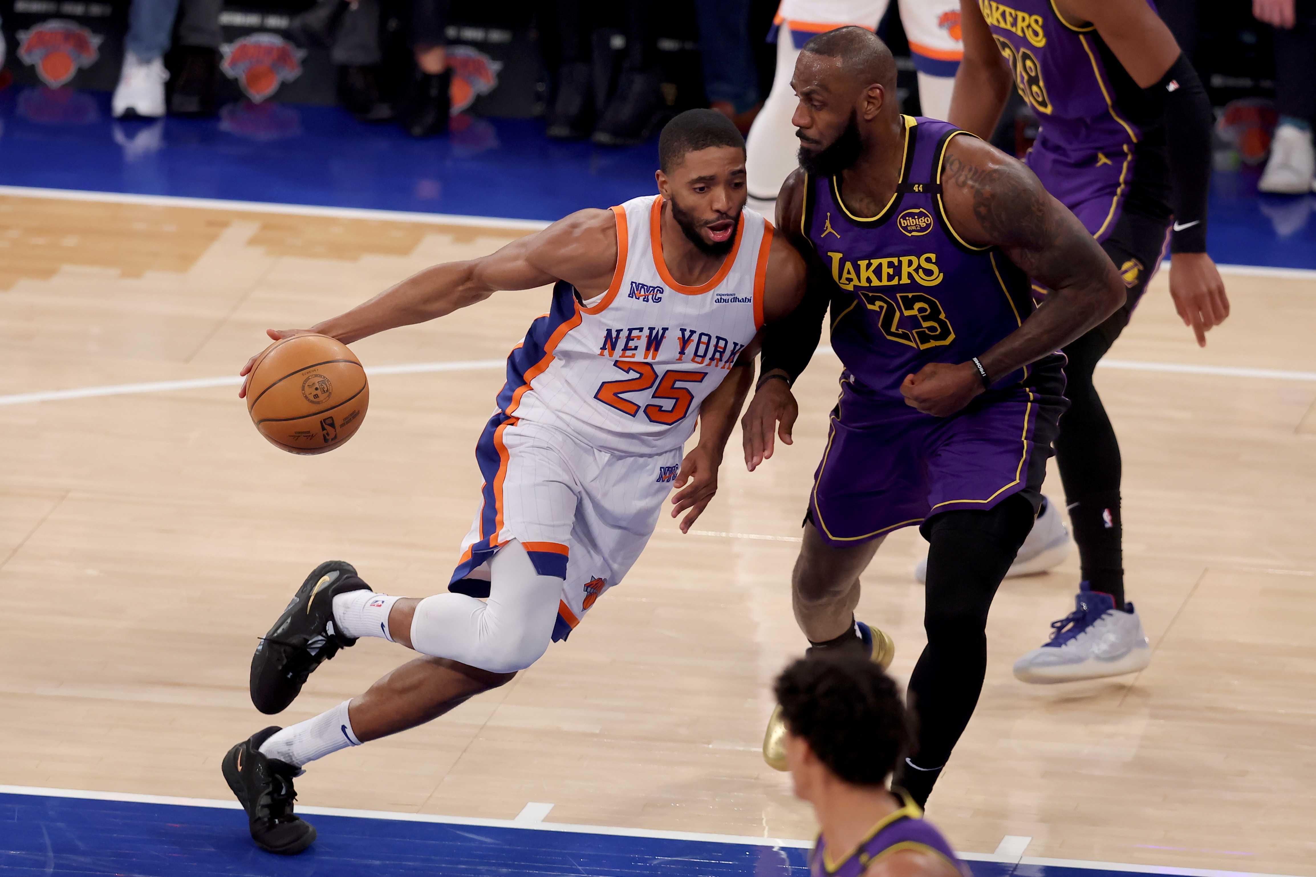 尼克斯也用唐斯低位單打去懲罰湖人小球陣,吸引夾擊,團(tuán)隊(duì)轉(zhuǎn)移球,布倫森、哈特、布里奇斯、阿努諾比輪番接球二次啟動(dòng),五外拉開(kāi),往復(fù)突分,人人都能持球攻,按住葫蘆浮起瓢;一旦唐斯休息,尼克斯圍繞阿丘瓦擋拆和手遞手聯(lián)動(dòng)外圍攻擊點(diǎn),185公分的麥克布萊德在和阿丘瓦二人轉(zhuǎn)中打出了震撼的干拔跳投表現(xiàn),緊咬分差,死戰(zhàn)不退。