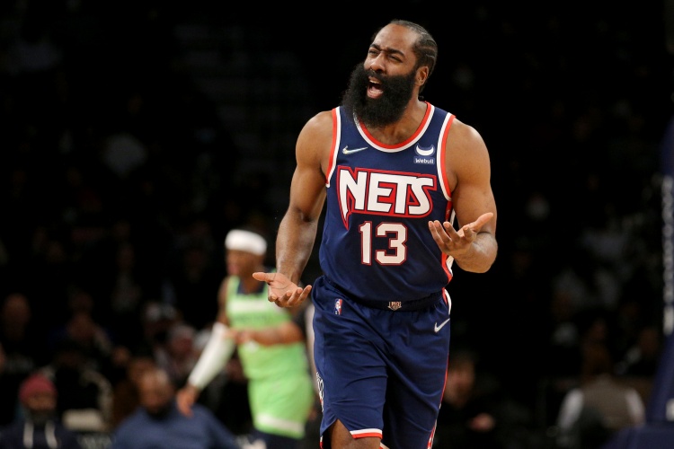 2022年哈登向籃網(wǎng)申請交易,最終被送至76人