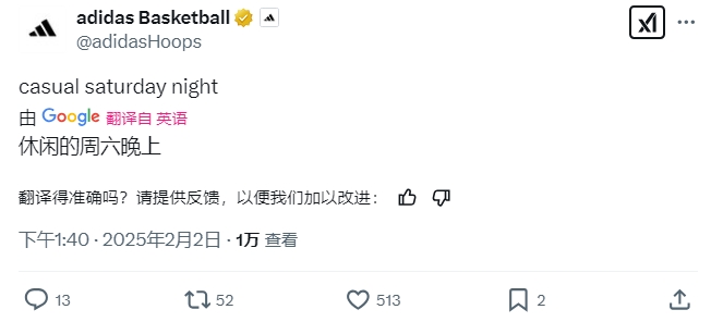 發(fā)布時(shí)間:2025年02月02日 14:53點(diǎn)擊:欄目:籃球新聞 除特別注明外,本站所有內(nèi)容均為九球直播整理排版,轉(zhuǎn)載請(qǐng)注明出處:耐克球星巨型交易!阿迪達(dá)斯官推:休閑的周六夜晚 本文標(biāo)簽: 籃球 nba 湖人 獨(dú)行俠 小牛