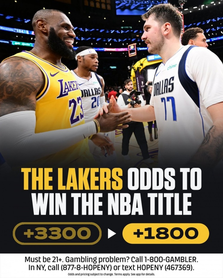 博彩網(wǎng)站更新了湖人奪冠賠率,從+3300(押100若中連本帶利返3400)暴漲至+1800。