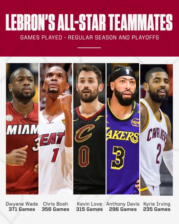 - 能聯(lián)手東契奇打幾場?詹姆斯生涯全明星隊友:韋德/濃眉/歐文在列