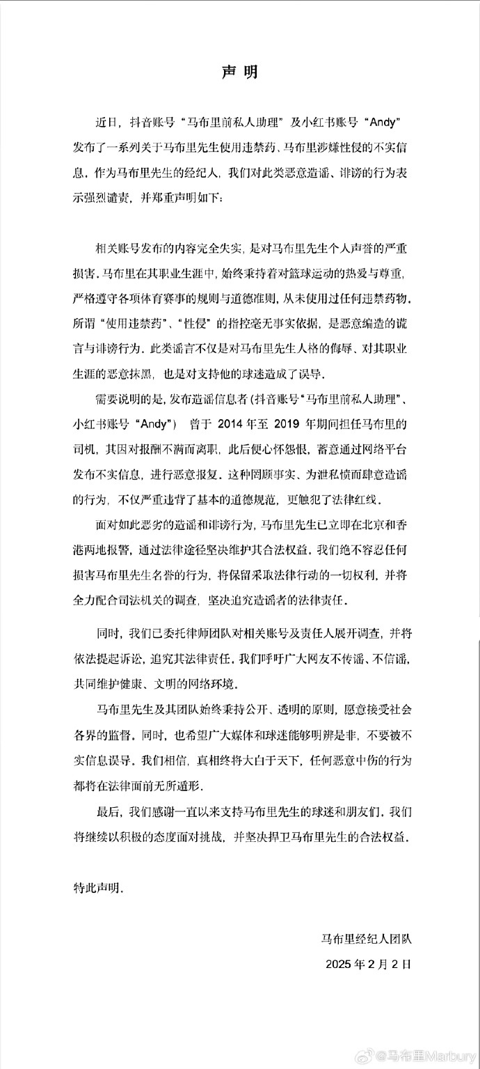 馬布里隨后通過個(gè)人微博發(fā)布了一篇其經(jīng)紀(jì)人團(tuán)隊(duì)撰寫的澄清信,證實(shí)了馬布里已報(bào)警的說法,并對(duì)“Andy”進(jìn)行了強(qiáng)烈譴責(zé),原文如下: