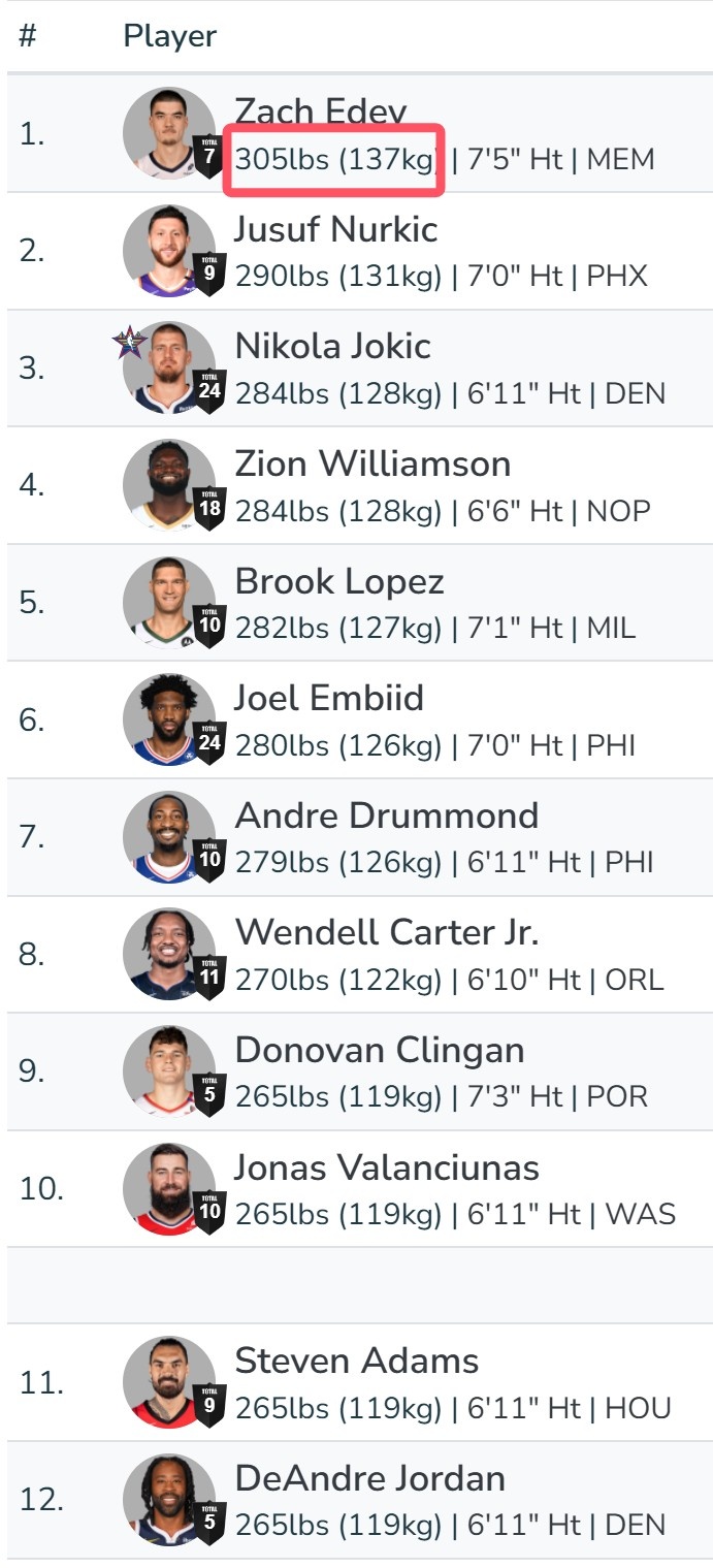 - 聯(lián)盟第8重東契奇體重270磅超瓦蘭/亞當斯等內(nèi)線 錫安284磅