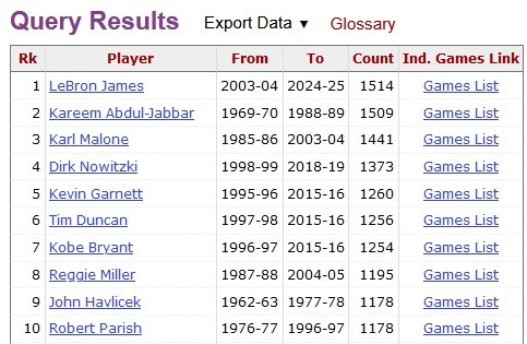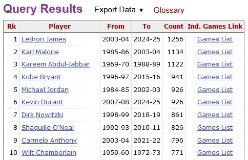 10+榜,詹姆斯1515次高居榜首:
