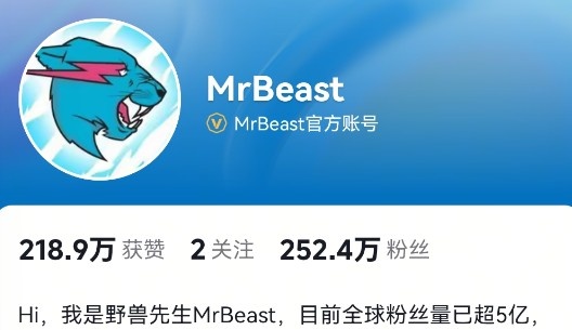 MrBeast原名James Steven “Jimmy” Donaldson,美國Youtube視頻博主。其作為核心成員的MrBeast團(tuán)隊(duì)頻道在Youtube上擁有3.55億粉絲;他在B站有402萬粉絲,在抖音有252萬粉絲,目前全球粉絲量超5億。