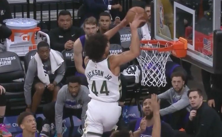 4、字母哥快攻接球,罰球線前一步起跳扣翻武切維奇。
