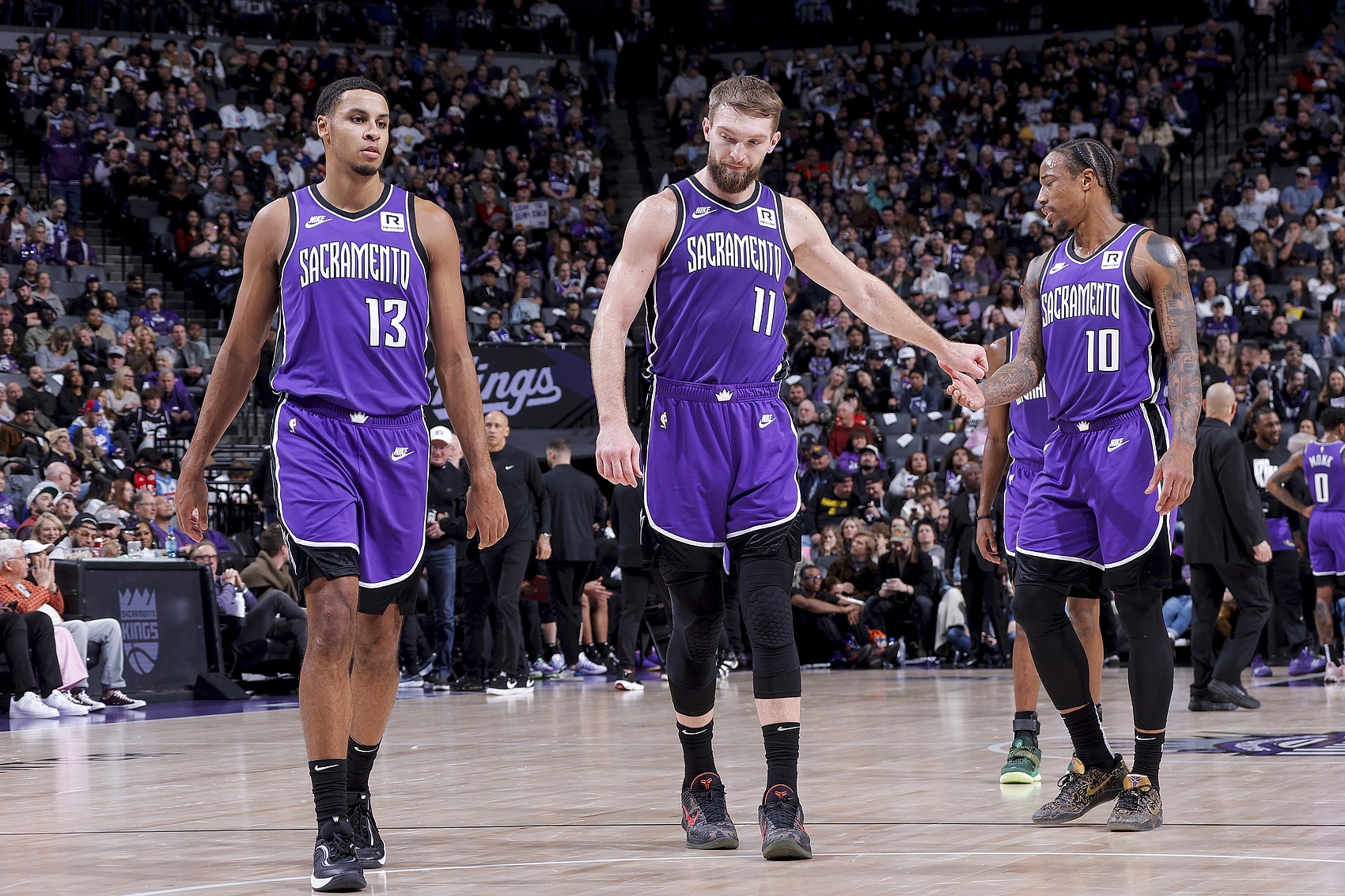 在某種程度上,拉文的高產(chǎn)量三分投籃(本賽季場均7.3次出手,三分命中率45%,高于職業(yè)生涯的39%)可能更適合國王的首發(fā)陣容,其中德羅贊(場均2.7次出手)和薩博尼斯(場均2.4次出手,盡管三分命中率為47%)都是低產(chǎn)量的三分射手。根據(jù)NBA的高階統(tǒng)計(jì)數(shù)據(jù),在本賽季至少一起打了750分鐘的40個三人組陣容中,國王有4個三分出手率最低的陣容,其中就包括德羅贊、??怂购退_博尼斯三人組。這在進(jìn)攻上并不致命,但確實(shí)給國王的季后賽進(jìn)攻設(shè)置了一定的上限。