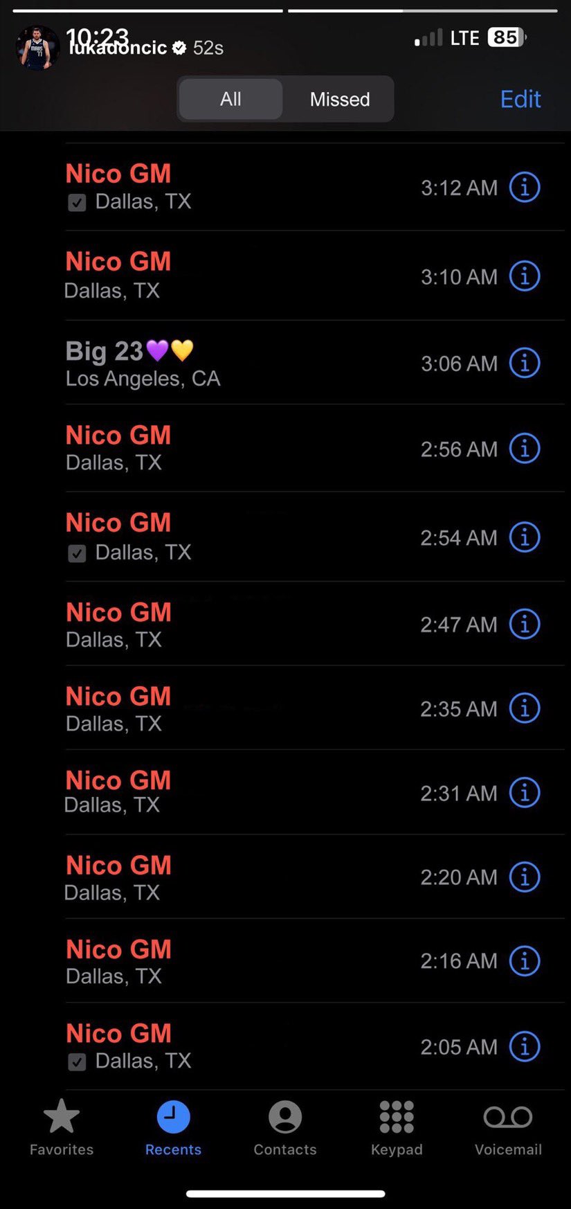 網(wǎng)傳被送去湖人的東契奇在社媒上曬出自己的通話記錄,獨(dú)行俠總經(jīng)理兼運(yùn)營(yíng)總裁哈里森連打10個(gè)電話他都沒(méi)接,但接了新隊(duì)友詹姆斯的電話。
