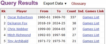 據(jù)統(tǒng)計(jì),這是??怂股牡?9次單場(chǎng)砍下至少30+5+5,排名國(guó)王隊(duì)史第二,僅次于奧斯卡-羅伯特森的337場(chǎng)。