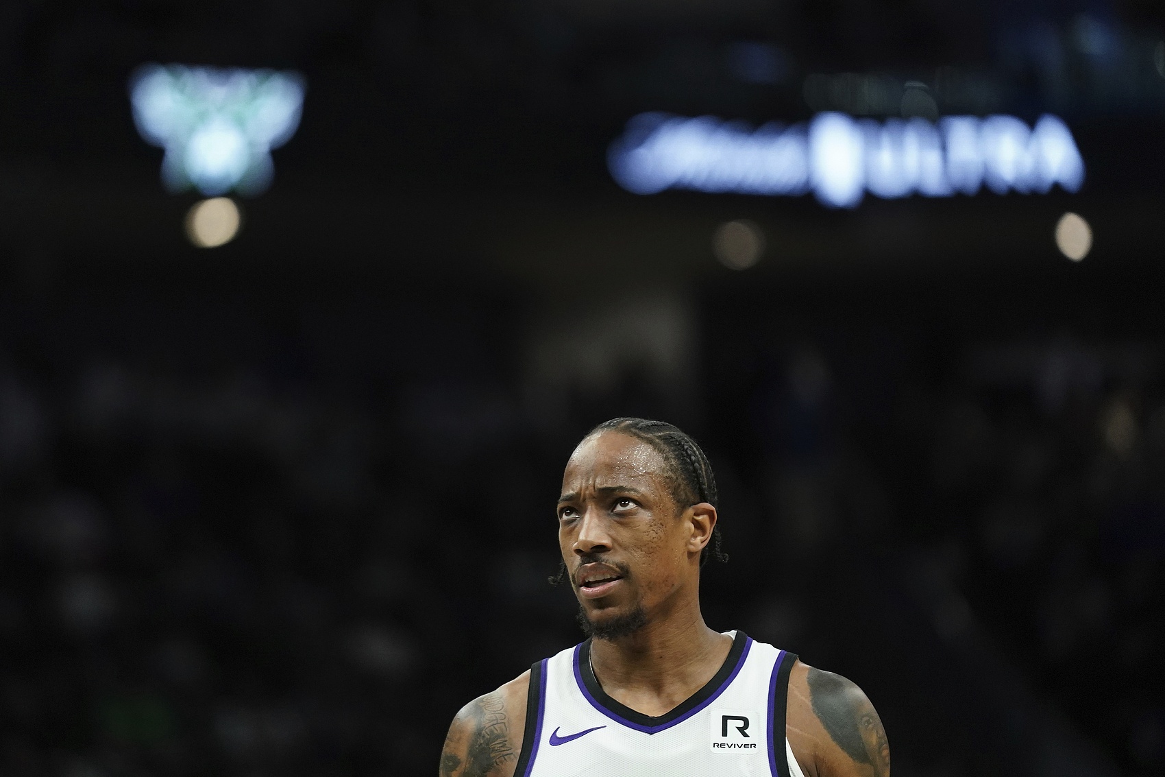 此役國王前鋒德羅贊表現(xiàn)出色,打了37分鐘25投14中,三分4中2、罰球4中3砍全場最高33分外加5籃板7助攻。