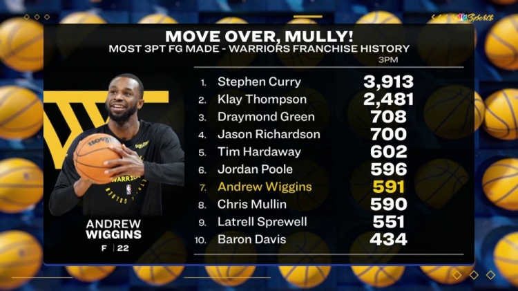 據(jù)統(tǒng)計(jì),本場(chǎng)過后維金斯升至勇士隊(duì)史三分命中數(shù)榜單第7位。具體排名如下: