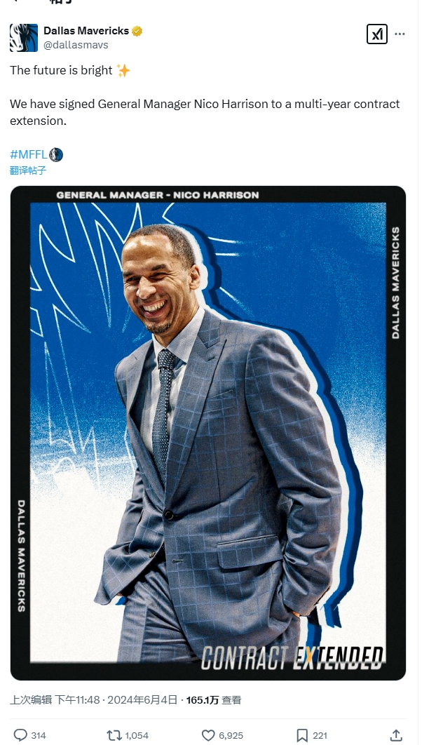 有網(wǎng)友挖出了去年6月獨(dú)行俠續(xù)約總經(jīng)理尼科-哈里森時(shí)的社媒,當(dāng)時(shí)獨(dú)行俠官方祝賀哈里森續(xù)約,并配文:未來一片光明。