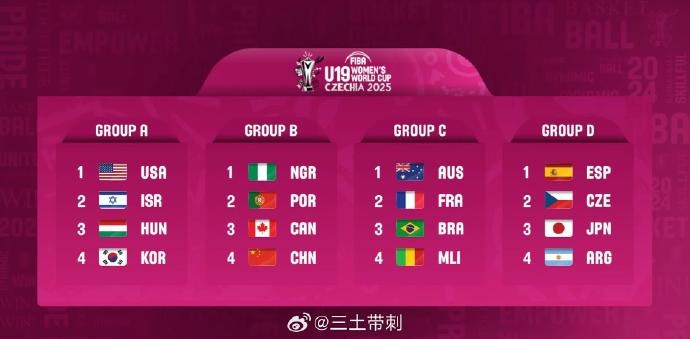 發(fā)布時間:2025年02月04日 18:52點擊:欄目:籃球新聞 2月4日訊 2025年U19女籃世界杯分組抽簽結束,中國女籃分到了B組,同組的有尼日利亞、葡萄牙、加拿大。具體分組如下:A組:美國、以色列、匈牙利、韓國B組:尼日利亞、葡萄牙、加拿大、中國C組:澳大利亞、法國、巴西、馬里D組:西班牙、捷克、日本、阿根廷U19女籃世界杯將在今年夏天7月12-20日在捷克布爾諾進行。 除特別注明外,本站所有內容均為九球直播整理排版,轉載請注明出處:U19女籃世界杯分組:中國女籃與尼日利亞、葡萄牙、加拿大同分B組 本文標簽: CBA 中國籃球 籃球 WCBA 中國女籃 轉載