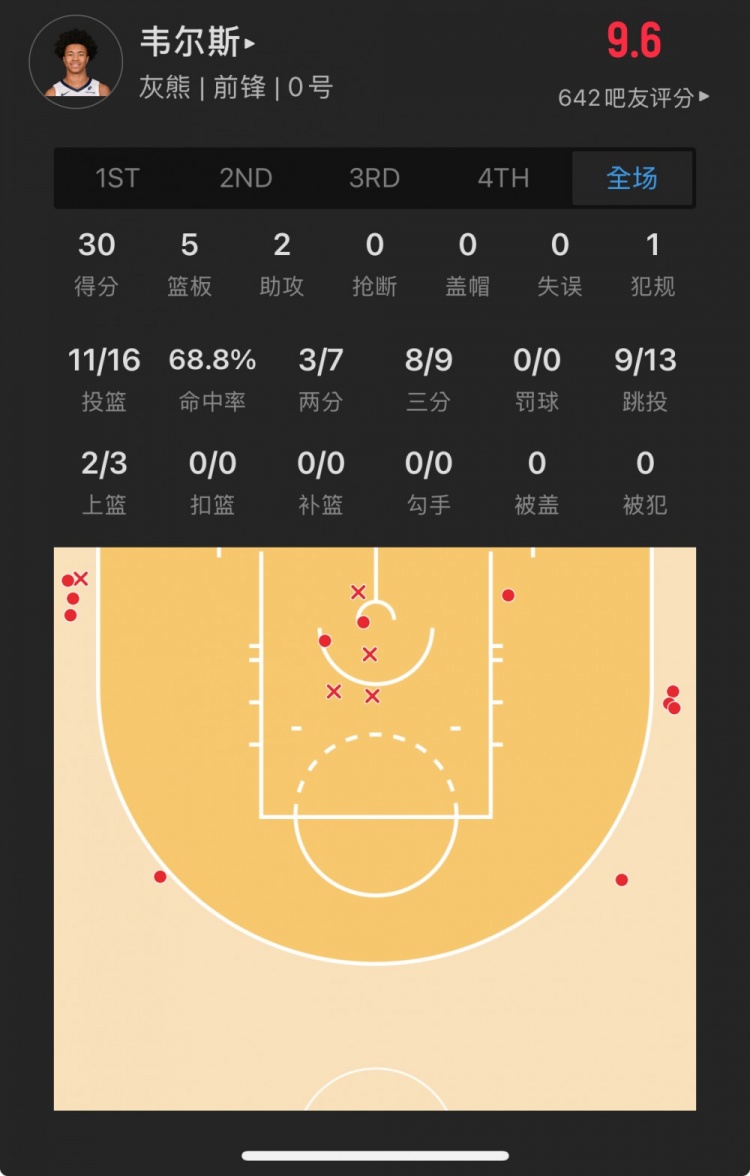 灰熊39號(hào)秀 杰倫-韋爾斯 登場(chǎng)36.1分鐘