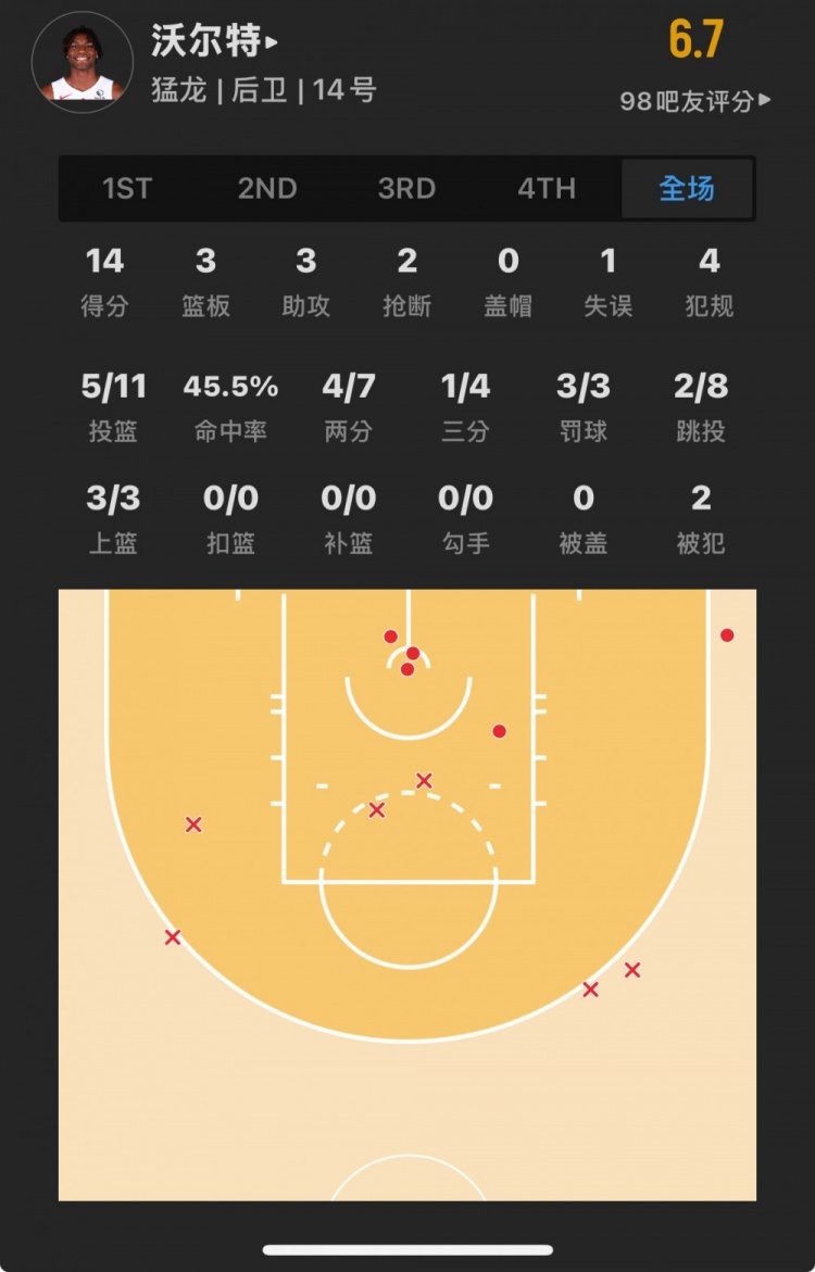 猛龍19號(hào)秀 賈科比-沃爾特 登場(chǎng)28.2分鐘