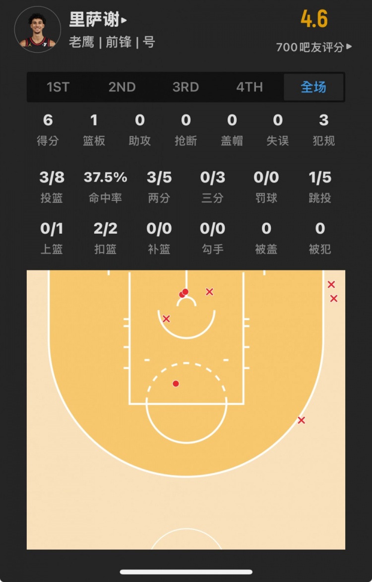 老鷹狀元秀 扎卡里-里薩謝 登場(chǎng)23.3分鐘