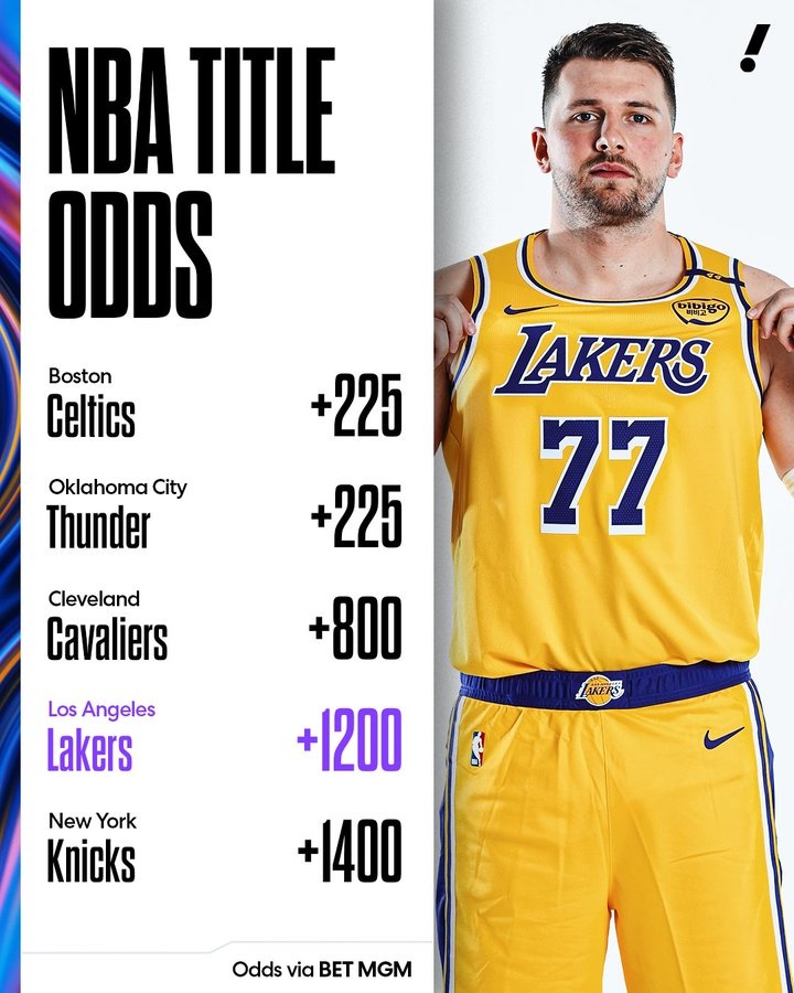 雅虎體育曬出最新的球隊奪冠賠率,湖人在達成東契奇、馬威的交易后,賠率從+4000來到+1200,升至聯(lián)盟第四位!前五排行如下: