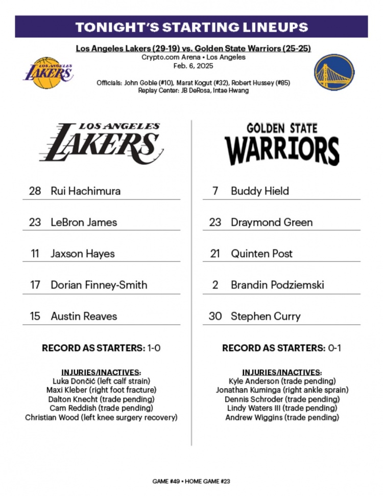 發(fā)布時(shí)間:2025年02月07日 11:50點(diǎn)擊:欄目:籃球新聞 2月7日訊 今天中午11點(diǎn),湖人將主場對(duì)陣勇士。賽前,雙方公布了首發(fā)陣容。湖人:八村塁、詹姆斯、海斯、芬尼、里夫斯。勇士:希爾德、追夢、波斯特、波杰姆斯基、庫里。 除特別注明外,本站所有內(nèi)容均為九球直播整理排版,轉(zhuǎn)載請注明出處:湖勇大戰(zhàn)首發(fā):詹姆斯、里夫斯擔(dān)綱 迎接庫追組合挑戰(zhàn) 本文標(biāo)簽: nba 籃球 勇士 湖人 詹姆斯 庫里 追夢