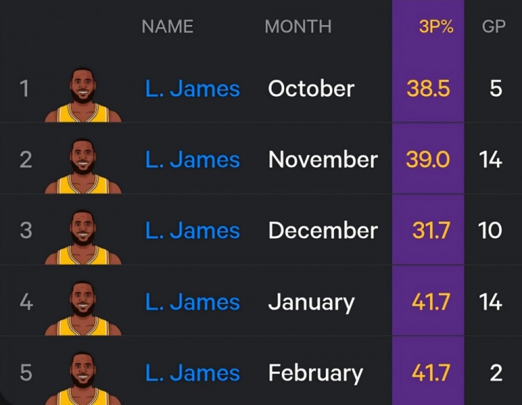 發(fā)布時間:2025年02月07日 11:51點擊:欄目:籃球新聞 除特別注明外,本站所有內(nèi)容均為九球直播整理排版,轉(zhuǎn)載請注明出處:漸入佳境!詹姆斯本賽季每月三分命中率一覽 1月至今高達(dá)41.7% 本文標(biāo)簽: nba 籃球 西部 湖人 詹姆斯