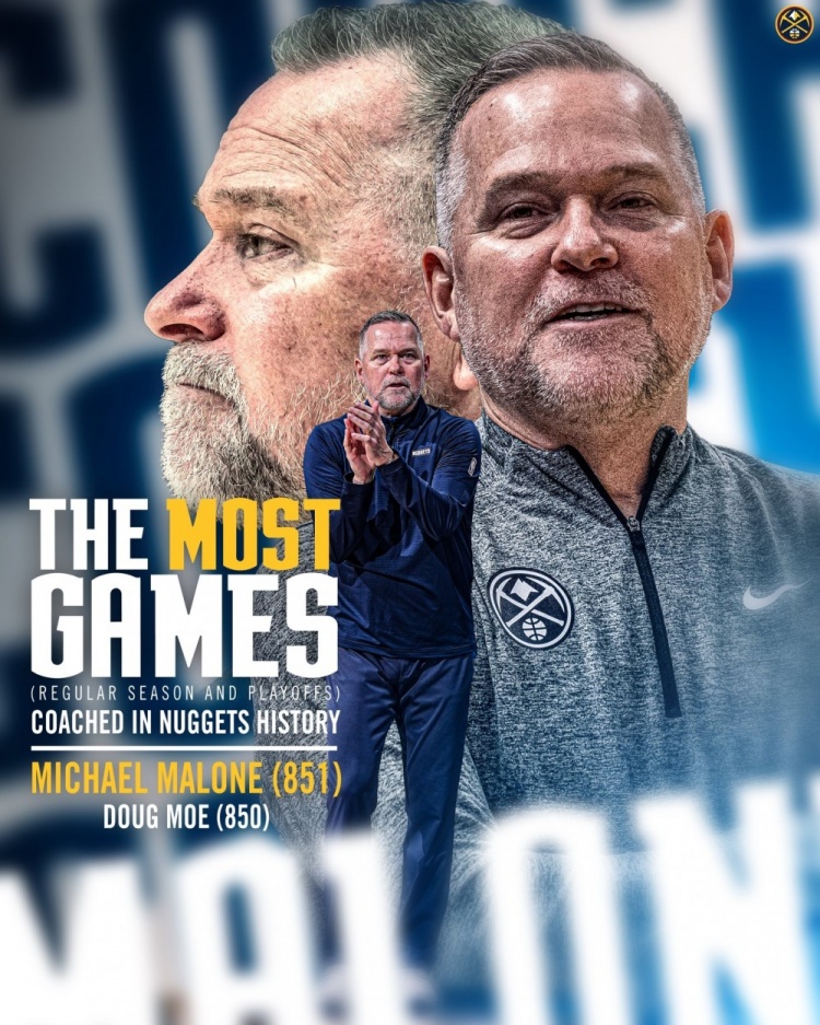今天掘金官方更推顯示,主帥邁克-馬龍執(zhí)教場數(shù)來到了851場(常規(guī)賽+季后賽),超越道格-莫(850場)升至掘金隊史第一。