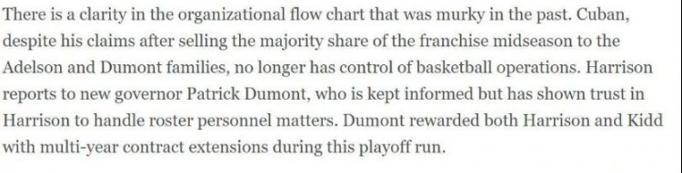2024年6月底,選秀大會(huì)前夕,據(jù)ESPN的麥克馬洪報(bào)道,庫(kù)班已經(jīng)不再參與獨(dú)行俠隊(duì)的運(yùn)營(yíng)工作,而由獨(dú)行俠隊(duì)的總經(jīng)理哈里森,直接向新老板杜蒙特匯報(bào)。