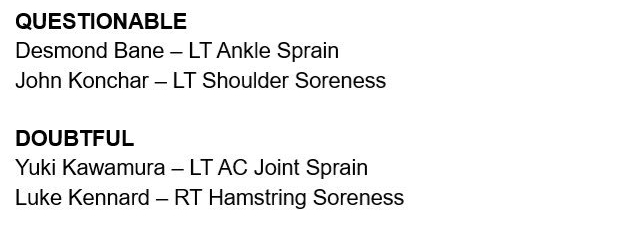 傷病報告顯示,河村勇輝的傷從左肩酸痛更新為左肩肩鎖關(guān)節(jié)扭傷,從出戰(zhàn)成疑(50%)轉(zhuǎn)為小概率出戰(zhàn)(25%)。