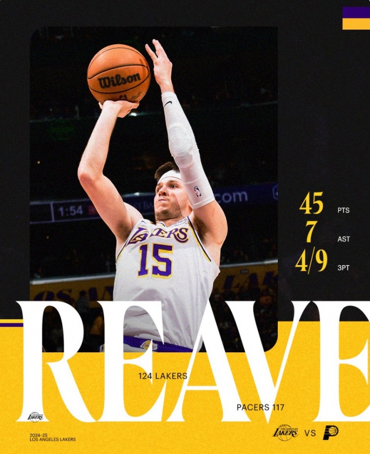 賽后,湖人官方曬出了贏球海報,里夫斯榮登封面。