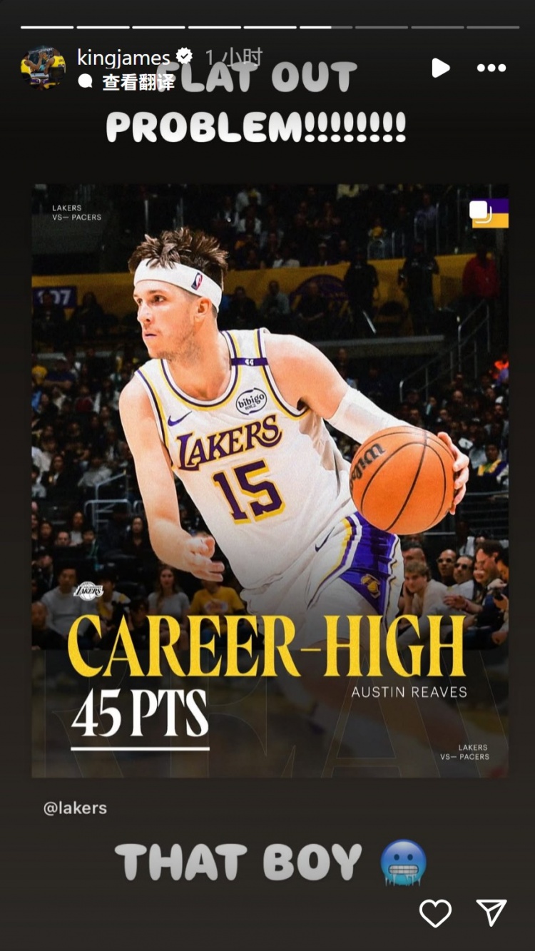 發(fā)布時間:2025年02月09日 09:59點擊:欄目:籃球新聞 2月9日訊 NBA常規(guī)賽,湖人在主場以124-117擊敗步行者。詹姆斯本場缺陣。此役,里夫斯出戰(zhàn)40分30秒,投籃26中14,三分9中4,罰球13中13,得到45分7籃板7助攻3搶斷。賽后詹姆斯轉發(fā)了里夫斯本場表現(xiàn),寫道:“完全就是個大麻煩?。?!那小子 除特別注明外,本站所有內容均為九球直播整理排版,轉載請注明出處:里夫斯砍45分7板7助!詹姆斯INS:那小子完全就是個大麻煩! 本文標簽: 籃球 nba 湖人 詹姆斯