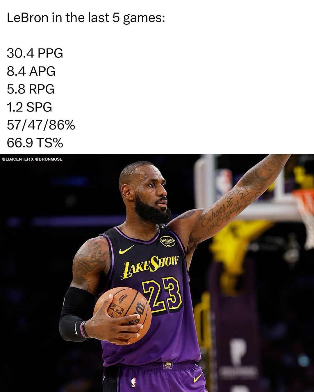 發(fā)布時(shí)間:2025年01月05日 09:50點(diǎn)擊:欄目:籃球新聞 除特別注明外,本站所有內(nèi)容均為九球直播整理排版,轉(zhuǎn)載請(qǐng)注明出處:恐怖如斯!詹姆斯過(guò)去五場(chǎng):場(chǎng)均30分6板8助 三項(xiàng)命中率57/47/86% 本文標(biāo)簽: 籃球 nba 湖人 詹姆斯