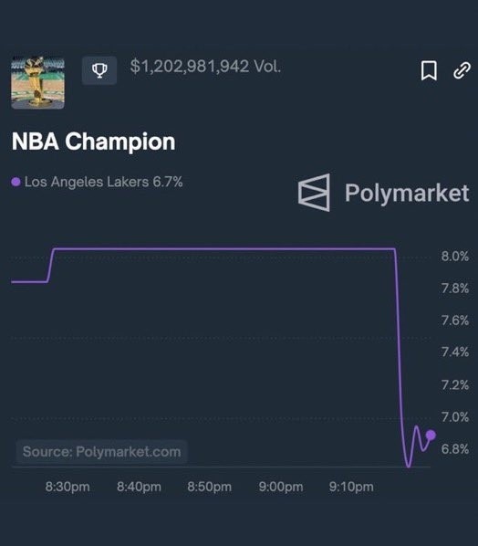 美媒Polymarket更新湖人本賽季奪冠概率,該數(shù)據(jù)從8%大幅下降到了6.7%。