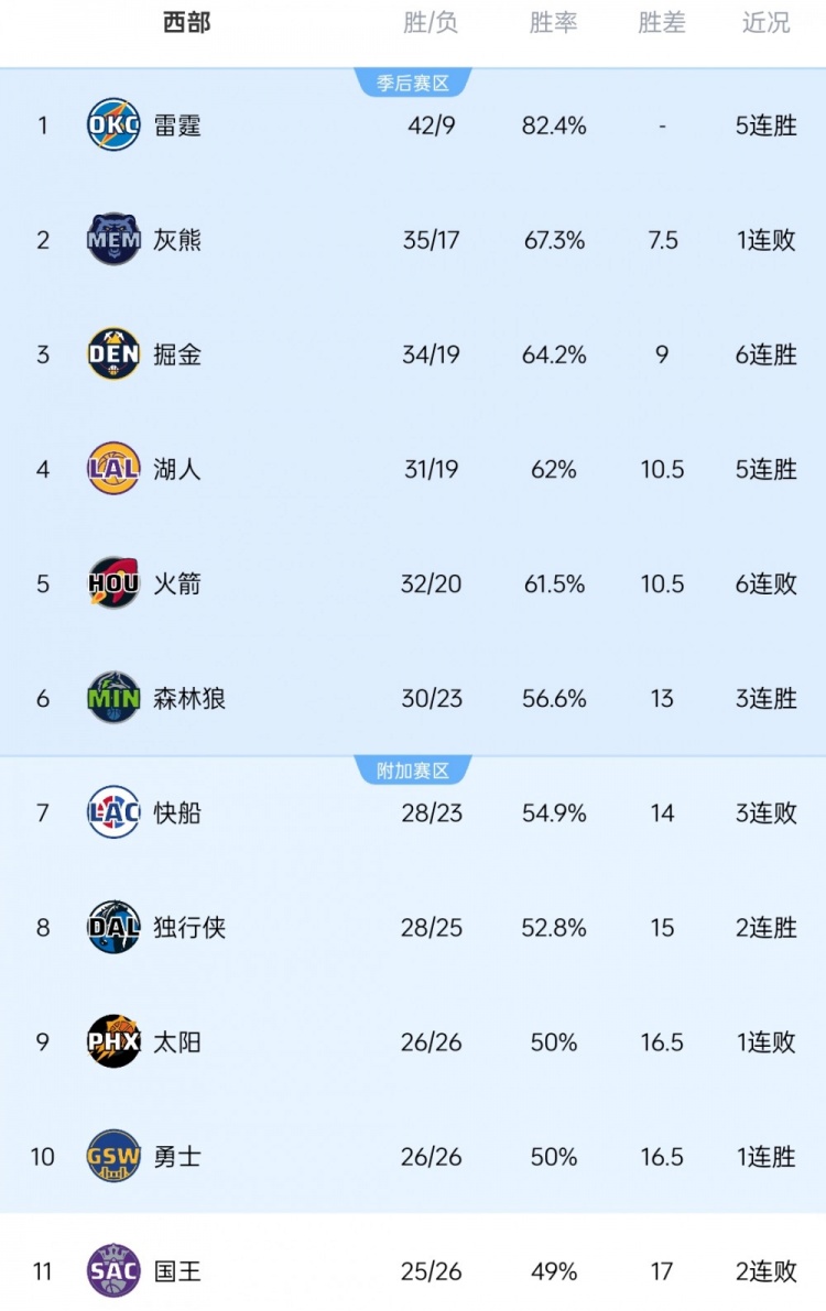 湖人和雷霆的5連勝緊隨其后。