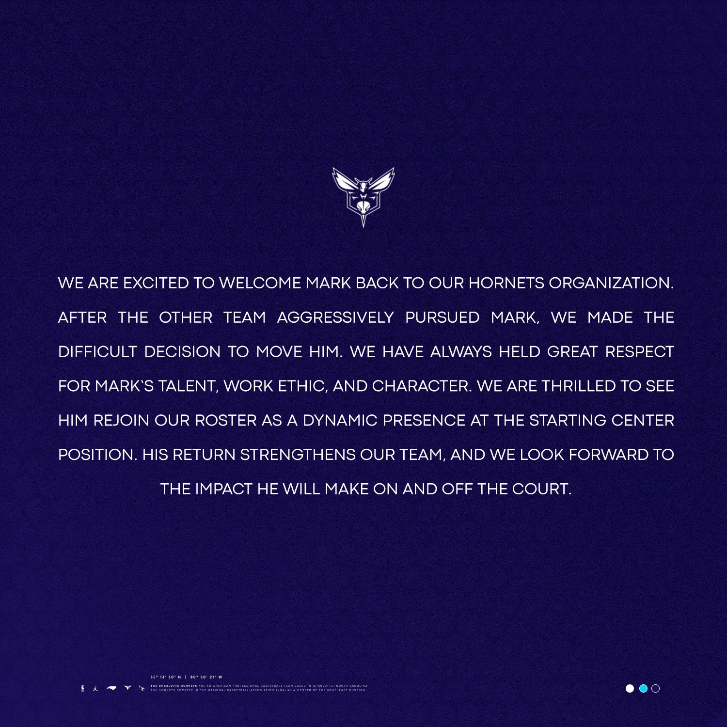 黃蜂官方寫到:“我們很高興的歡迎馬威回到我們的球隊。在另一支球隊積極追求馬威后,我們做出了艱難的決定,將他送走。我們一直非??粗伛R威的才華、職業(yè)態(tài)度和品格。我們很高興看到他回歸繼續(xù)擔(dān)任首發(fā)中鋒,他的回歸增強(qiáng)了我們的球隊,我們期待他在球場內(nèi)外的影響力。”