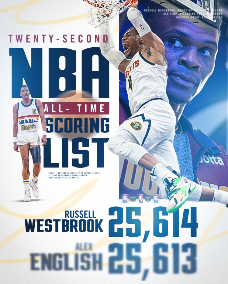 發(fā)布時(shí)間:2025年01月05日 10:50點(diǎn)擊:欄目:籃球新聞 1月5日訊 今日NBA常規(guī)賽,掘金半場(chǎng)54-55暫時(shí)落后馬刺。掘金球星威少上半場(chǎng)4投2中得到4分4籃板4助攻。這樣一來(lái),威少生涯得分已經(jīng)達(dá)到25615分,超越名宿阿歷克斯-英格利什(25613分)升至歷史第22位!本場(chǎng)賽前數(shù)據(jù) 除特別注明外,本站所有內(nèi)容均為九球直播整理排版,轉(zhuǎn)載請(qǐng)注明出處:威少生涯得分達(dá)25615分 超越名宿英格利什升至歷史第22位! 本文標(biāo)簽: nba 籃球 西部 掘金 威少